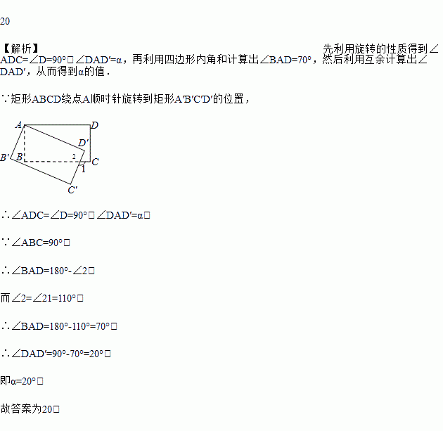 如图,将长方形绕点顺时针旋转到长方形AB′C′D′的位置,旋转角为.若,则_____度.