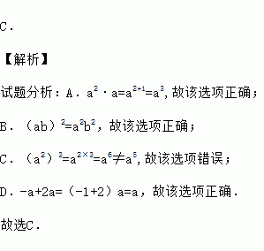C. 【解析】 试题分析:A.a2·a=a2+1=a3,故该选项正确; B.(ab)2=a2b2,故该选项正确; C.(a2)3=a2×3=a6≠a5,故该选项错误; D.-a+2a=(-1+2)a=a,故该选项正确. 故选C.