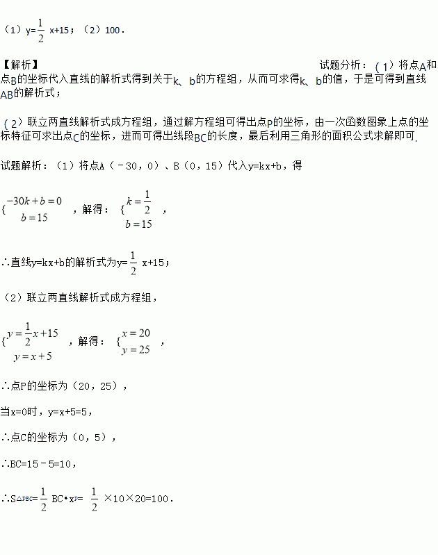 (1)y=x+15;(2)100. 【解析】试题分析:(1)将点A和点B的坐标代入直线的解析式得到关于k、b的方程组,从而可求得k、b的值,于是可得到直线AB的解析式; (2)联立两直线解析式成方程组,通过解方程组可得出点P的坐标,由一次函数图象上点的坐标特征可求出点C的坐标,进而可得出线段BC的长度,最后利用三角形的面积公式求解即可. 试题解析:(1)将点A(﹣30,0)、B(...