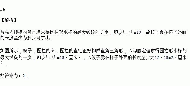 如图,将一根长24厘米的筷子,置于底面直径为6厘米,高为8厘米的圆柱形水杯中,则筷子露在杯子外面的长度至少为_____厘米.