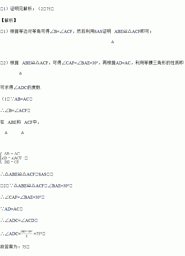 如图,△ABC中,AB=AC,点E,F在边BC上,BE=CF,点D在AF的延长线上,AD=AC.