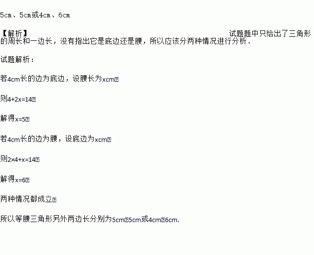 已知等腰三角形的周长是14cm.若其中一边长为4cm,求另外两边长.