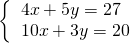 4辆板车和5辆卡车一次能运27吨货,10辆板车和3车卡车一次能运货20吨,设每辆板车每次可运x吨货,每辆卡车每次能运y吨货,则可列方程组( )