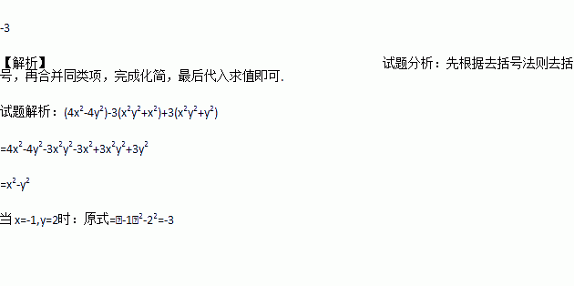 (4x2-4y2)-3(x2y2+x2)+3(x2y2+y2),其中x=-1,y=2