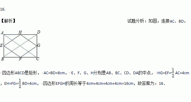 如图,已知矩形ABCD的对角线长为8cm,E、F、G、H分别是AB、BC、CD、DA的中点,则四边形EFGH的周长等于_____cm.