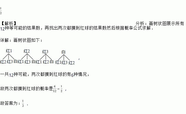 一个仅装有球的不透明布袋里共有4个球(只有颜色不同),其中3个是红球,1个是白球,从中任意摸出一个球,记下颜色后不放回,搅匀,再任意摸出一个球,则两次摸出都是红球的概率是_____.