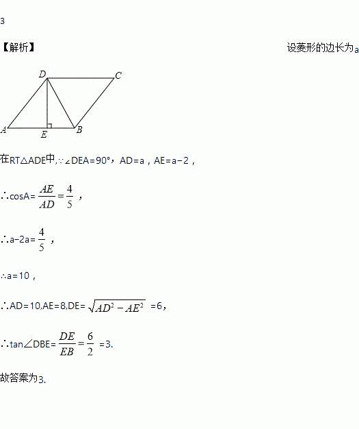 (2016·昆山市二模)如图,在菱形ABCD中,DE⊥AB,cosA=,BE=2,则tan∠DBE=________.