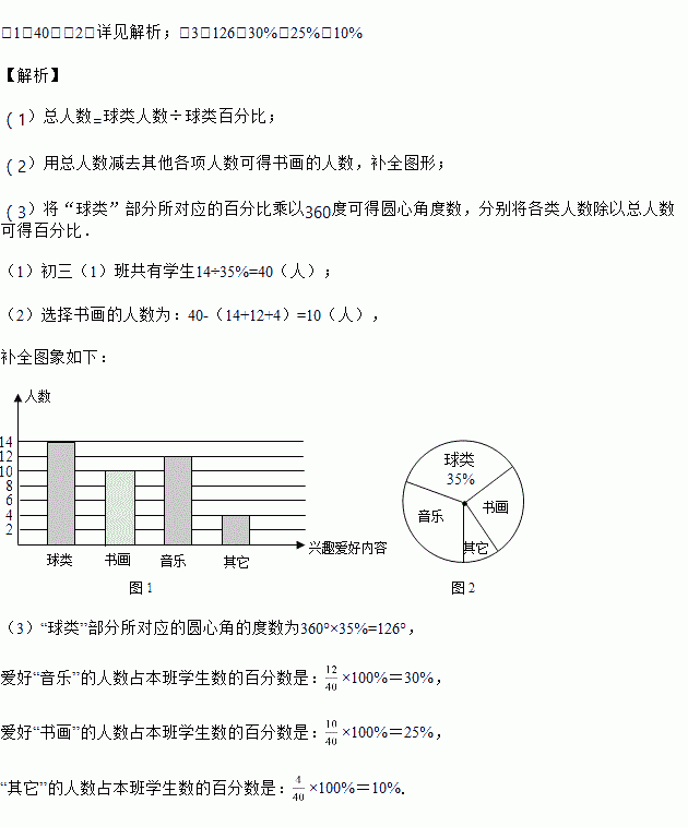 (3)在图2中,“球类”部分所对应的圆心角的度数________度;爱好“音乐”的人数占本班学生数的百分数是________;爱好“书画”的人数占本班学生数的百分数是________;“其它”的人数占本班学生数的百分数是________.
