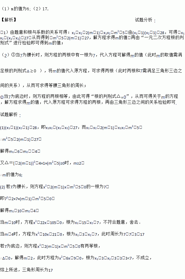 (1)m的值为6;(2)17. 【解析】试题分析: (1)由题意和根与系数的关系可得:x1+x2=2(m+1),x1x2=m2+5;由(x1-1)(x2-1)=28,可得:x1x2-(x1+x2)=27;从而得到:m2+5-2(m+1)=27,解方程求得m的值,再由“一元二次方程根的判别式”进行检验即可得到m的值; (2)①当7为腰长时,则方程的两根中有一根为7,代入方程可解得m...