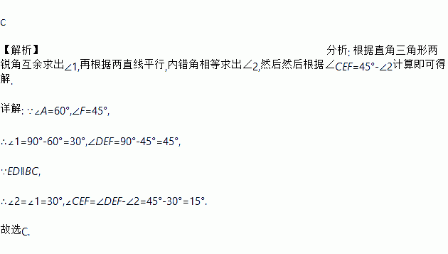 将一副直角三角板ABC和EDF如图放置(其中∠A=60?,∠F=45?).使点E落在AC边上,且ED∥BC,则∠CEF的度数为( )
