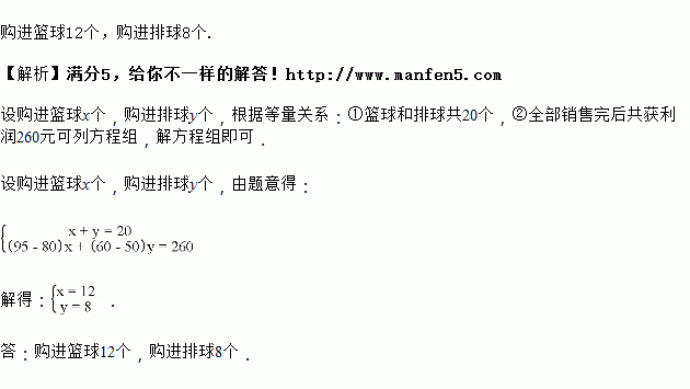 体育文化用品商店购进篮球和排球共20个,进价和售价如表,全部销售完后共获利润260元,求商店购进篮球,排球各多少个?