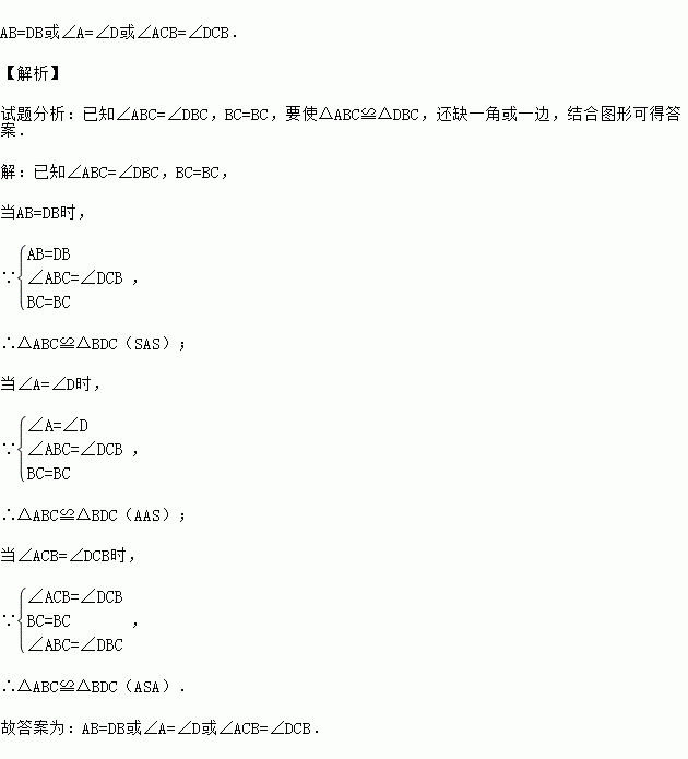 如图,已知∠ABC=∠DBC,要使△ABC≌△DBC,请添加一个条件 .(只需写出一个条件)