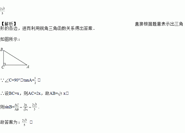 在△ABC中,∠C=90°,若tanA=,则sinB=______.