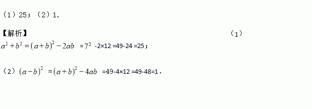已知:a+b=7,ab=12.求:(1)a2+b2;(2)(a-b)2的值.