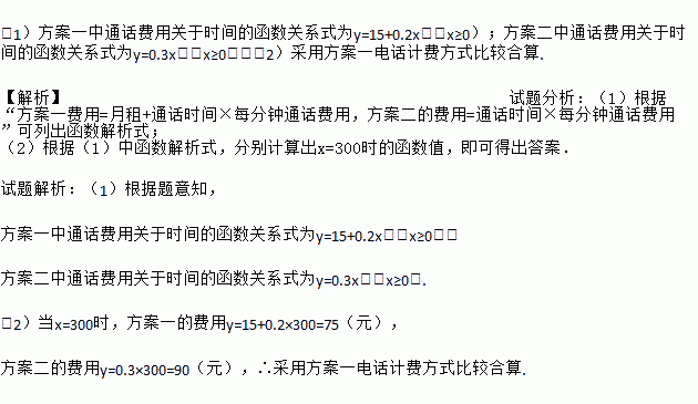 (1)方案一中通话费用关于时间的函数关系式为y=15+0.2x,(x≥0);方案二中通话费用关于时间的函数关系式为y=0.3x,(x≥0);(2)采用方案一电话计费方式比较合算. 【解析】试题分析:(1)根据“方案一费用=月租+通话时间×每分钟通话费用,方案二的费用=通话时间×每分钟通话费用”可列出函数解析式; (2)根据(1)中函数解析式,分别计算出x=300时的函数值,即可得出答案. ...