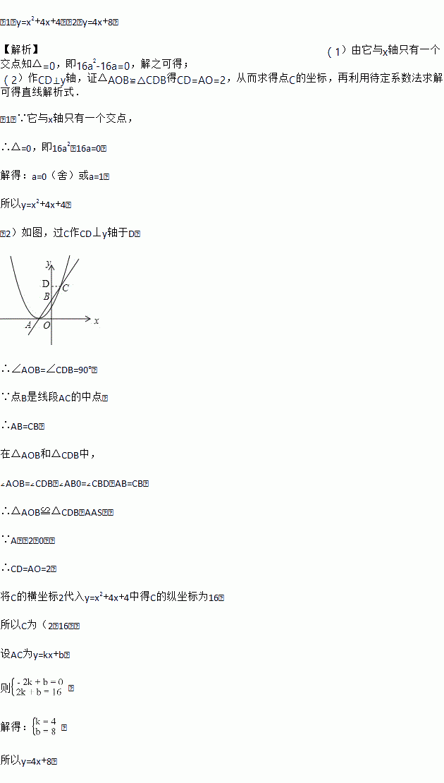 如图,抛物线y=ax2+4ax+4与x轴仅有一个公共点,经过点A的直线交该抛物线于点C,交y轴于点B,且点B是线段AC的中点,