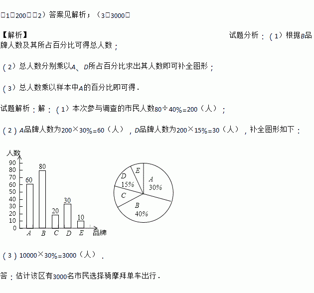 (3)若某区有10000名市民骑共享单车出行,根据调查数据估计该区有多少名市民选择骑摩托单车出行?