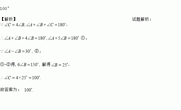 在△ABC中,∠A-∠B=30°、∠C=4∠B,则∠C=________.