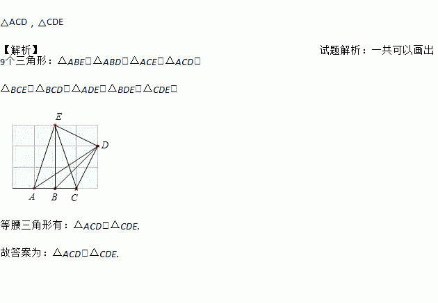 如图,方格中的点A、B、C、D、E称为“格点”,以这5个格点中的任意3点为顶点画三角形,其中的等腰三角形是___________________________.