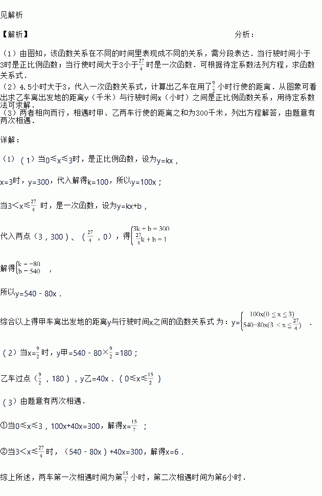 已知:甲、乙两车分别从相距300千米的 A,B两地同时出发相向而行,其中甲到 B地后立即返回,下图是它们离各自出发地的距离y(千米)与行驶时间x(小时)之间的函数图象.