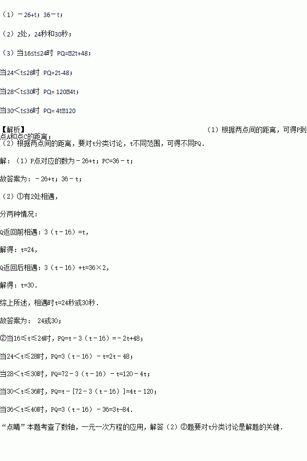 ÒÑÖªÊýÖáÉÏÓÐA¡¢B¡¢CÈýµã£¬·Ö±ð±íʾÓÐÀíÊý£26£¬£10£¬10£¬¶¯µãP´ÓA³ö·¢£¬ÒÔÿÃë1¸öµ¥Î»µÄËÙ¶ÈÏòÖÕµãCÒÆ¶¯£¬ÉèµãPÒÆ¶¯Ê±¼äΪtÃ룮