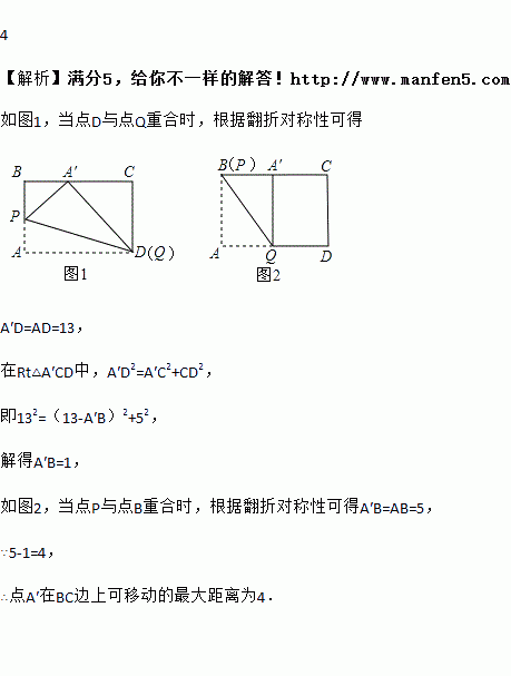 在矩形纸片ABCD中,AB=5,AD=13.如图所示,折叠纸片,使点A落在BC边上的A?处,折痕为PQ,当点A?在BC边上移动时,折痕的端点P、Q也随之移动.若限定点P、Q分别在AB、AD边上移动,则点A?在BC边上可移动的最大距离为_________.![]()