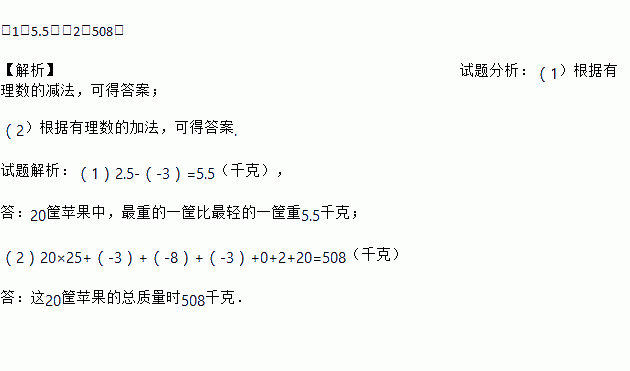(1)在这20筐苹果中,最重的一筐比最轻的一筐重多少千克?