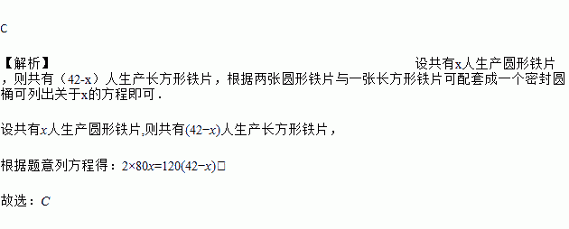 包装厂有42名工人,每人平均每天可以生产圆形铁片120片或长方形铁片80片.为了每天生产的产品刚好制成一个密封的圆桶,应该分配多少名工人生产圆形铁片,多少名工人生产长方形铁片?设应分配x名工人生产长方形铁片,(42-x)名工人生产圆形铁片,则下列所列方程正确的是( )