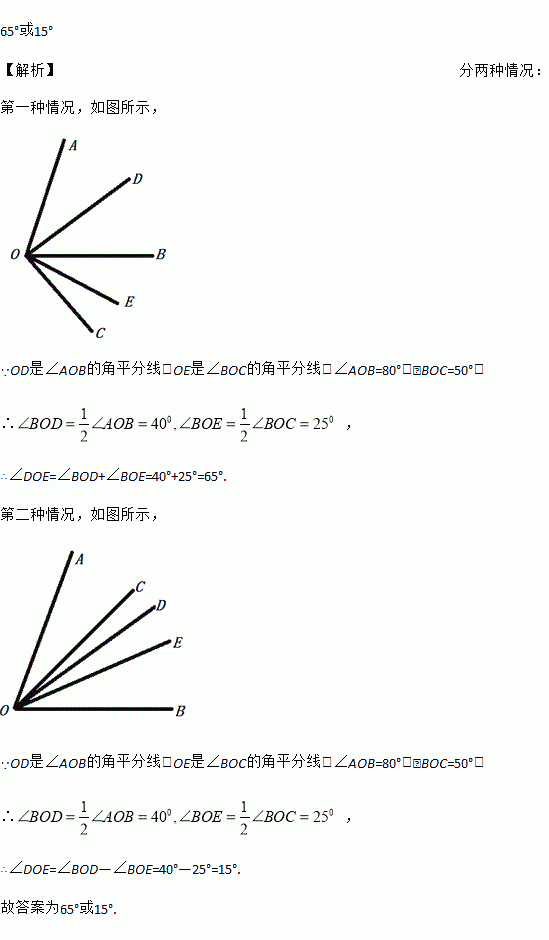 65°或15° 【解析】分两种情况: 第一种情况,如图所示, ∵OD是∠AOB的角平分线,OE是∠BOC的角平分线,∠AOB=80°,∠BOC=50°, ∴ , ∴∠DOE=∠BOD+∠BOE=40°+25°=65°. 第二种情况,如图所示, ∵OD是∠AOB的角平分线,OE是∠BOC的角平分线,∠AOB=80°,∠BOC=50°, ∴ , ∴...