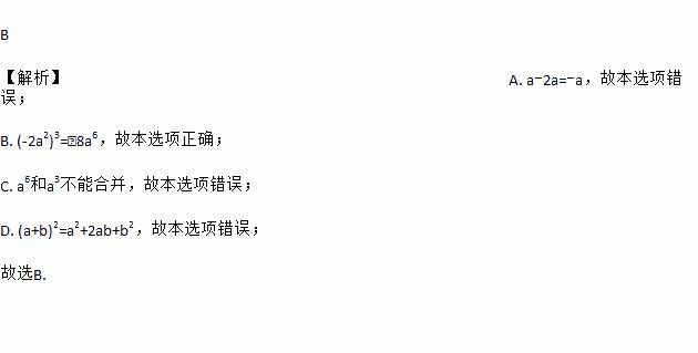 A. a-2a=a B. (-2a2)3=﹣8a6 C. a6+a3=a2 D. (a+b)2=a2+b2