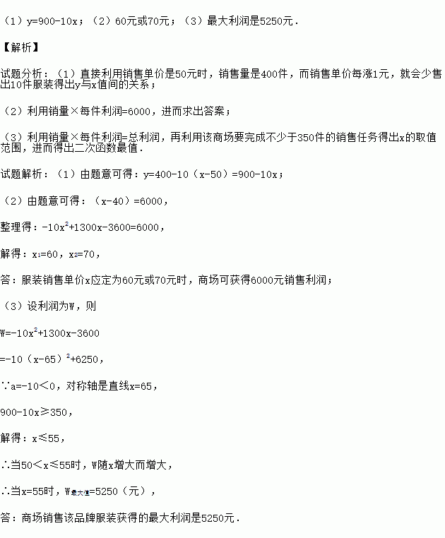 (3)在(1)问条件下,若该商场要完成不少于350件的销售任务,求商场销售该品牌服装获得的最大利润是多少?