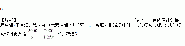某工程队要铺建一条长2000米的管道,采用新的施工方式,工作效率提高了25%,结果比原计划提前2天完成了任务,设这个工程队原计划每天要铺建x米管道,则依题意所列方程正确的是( )