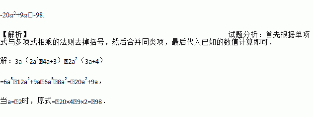 -20a2+9a,-98. 【解析】试题分析:首先根据单项式与多项式相乘的法则去掉括号,然后合并同类项,最后代入已知的数值计算即可. 【解析】 3a(2a2﹣4a+3)﹣2a2(3a+4) =6a3﹣12a2+9a﹣6a3﹣8a2=﹣20a2+9a, 当a=﹣2时,原式=﹣20×4﹣9×2=﹣98.