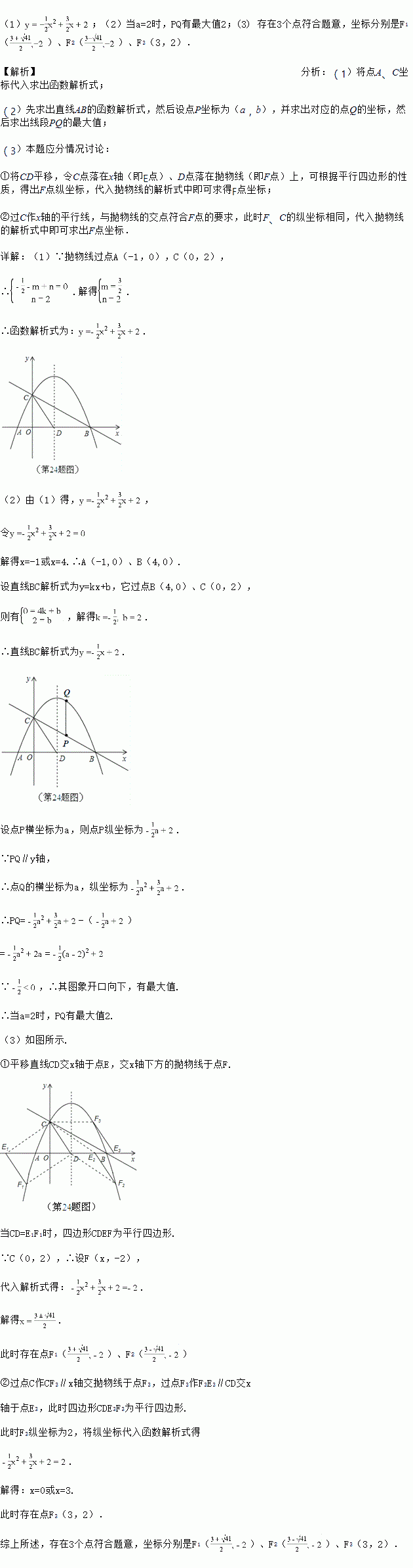 (3)若点E在轴上,点F在抛物线上.是否存在以C、D、E、F为顶点且以CD为一边的平行四边形?若存在,请你求出点F的坐标;若不存在,请说明理由.![]()