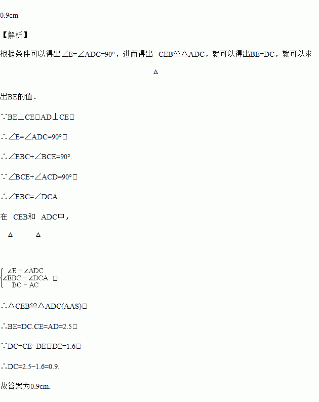 如图,∠ACB=90°,AC=BC,AD⊥CE于D,BE⊥CD于E,AD=2.5cm,DE=1.6cm,则BE的长度为________.