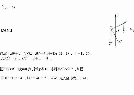 如图,在平面直角坐标系中,点A、B的坐标分别为(3,2)、(-1,0),若将线段BA绕点B顺时针旋转90°得到线段BA',则点A'的坐标为___.