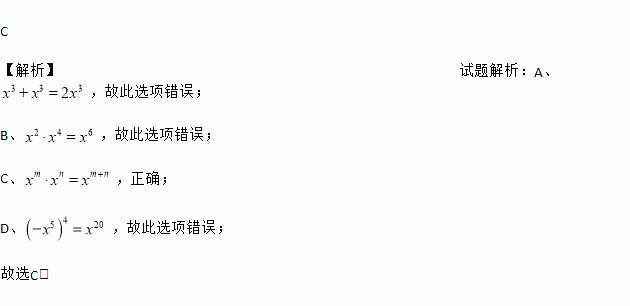 A. x3+x3=2x6 B. x2•x4=x8 C. xm•xn=xm+n D. (﹣x5)4=﹣x20