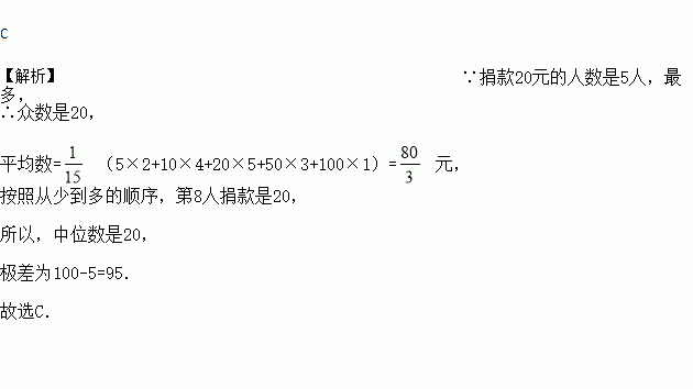 某班15名同学为灾区捐款,他们捐款数额统计如下: