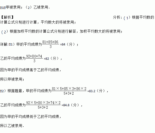 (1)若根据三项测试的平均成绩在甲、乙两人中录用一人,那么谁将被录用?