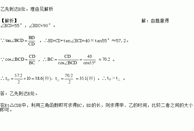 某海滨浴场东西走向的海岸线可以近似看作直线l(如图).救生员甲在A处的瞭望台上观察海面情况,发现其正北方向的B处有人发出求救信号,他立即沿AB方向径直前往救援,同时通知正在海岸线上巡逻的救生员乙.乙马上从C处入海,径直向B处游去.甲在乙入海10秒后赶到海岸线上的D处,再向B处游去.若CD=40米,B在C的北偏东35°方向,甲乙的游泳速度都是2米/秒.问谁先到达B处?请说明理由.
