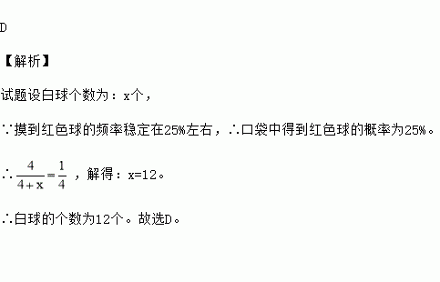 在一个不透明的口袋中装有4个红球和若干个白球,他们除颜色外其他完全相同.通过多次摸球实验后发现,摸到红球的频率稳定在25%附近,则口袋中白球可能有