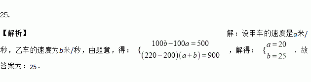 设甲、乙两车在同一直线公路上匀速行驶,开始时甲车在乙车的前面,当乙车追上甲车后,两车停下来,把乙车上的货物转给甲车,然后甲车继续前行,乙车向原地返回、.设xs后两车间的距离为ym,y与x的函数关系如图所示,则乙车的速度是_______m/s.