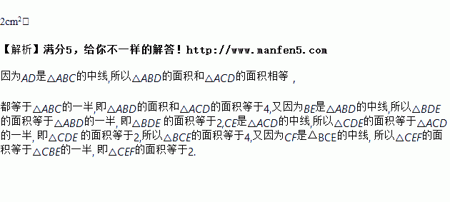 如图所示,在△ABC中,已知点D、 E、F分别为BC,AD,BE的中点.且S△ABC=8cm2,则图中△CEF的面积=_____.
