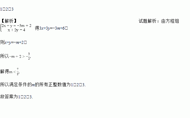 若关于x,y的二元一次方程组的解满足x+y>-,则满足条件的m的所有正整数值为________.
