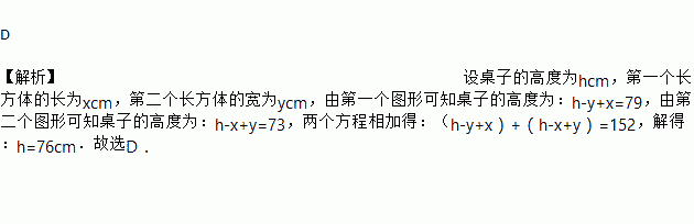 利用两块长方体木块测量一张桌子的高度.首先按图①方式放置,再交换两木块的位置,按图②方式放置.测量的数据如图,则桌子的高度是( )