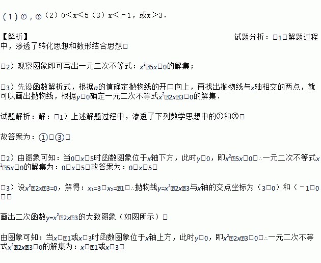 设x2﹣5x=0,解得:x1=0,x2=5,则抛物线y=x2﹣5x与x轴的交点坐标为(0,0)和(5,0).画出二次函数y=x2﹣5x的大致图象(如图所示),由图象可知:当x<0,或x>5时函数图象位于x轴上方,此时y>0,即x2﹣5x>0,所以,一元二次不等式x2﹣5x>0的解集为:x<0,或x>5.