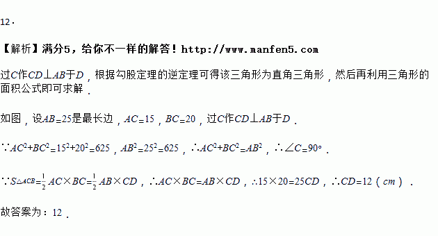 一个三角形的三边长分别为15cm、20cm、25cm,则这个三角形最长边上的高是_____ cm.