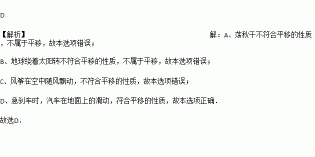 A. 荡秋千 B. 地球绕着太阳转 C. 风筝在空中随风飘动 D. 急刹车时,汽车在地面上的滑动