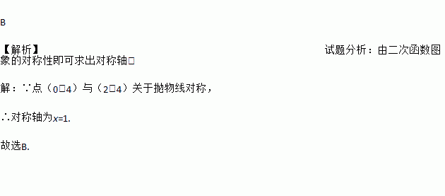 B 【解析】试题分析:由二次函数图象的对称性即可求出对称轴. 【解析】 ∵点(0,4)与(2,4)关于抛物线对称, ∴对称轴为x=1. 故选B.