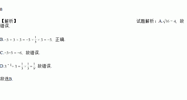 A. =±4 B. ﹣3÷3×3=﹣3 C. ﹣3﹣3=0 D. 3﹣1÷3=1